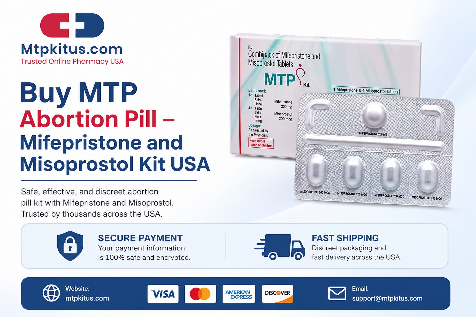 MTP kit abortion pill, also called Medical Termination of Pregnancy, a combination pack of mifepristone and misoprostol. It is used to terminate pregnancies for gestation of 70 days. MTP Kit is highly effective when used under guidance of healthcare professionals. Mifepristone and misoprostol cost range from $199. Know how mtp kit works? Mifepristone 200mg blocks progesterone hormone and 4 tablets of Mifepristone 200mcg causes the uterus to contract and bleed. Buy mifepristone and misoprostol online in the USA, UK or one can also buy mtp kit online with credit card from online pharmacy store mtpkitus.